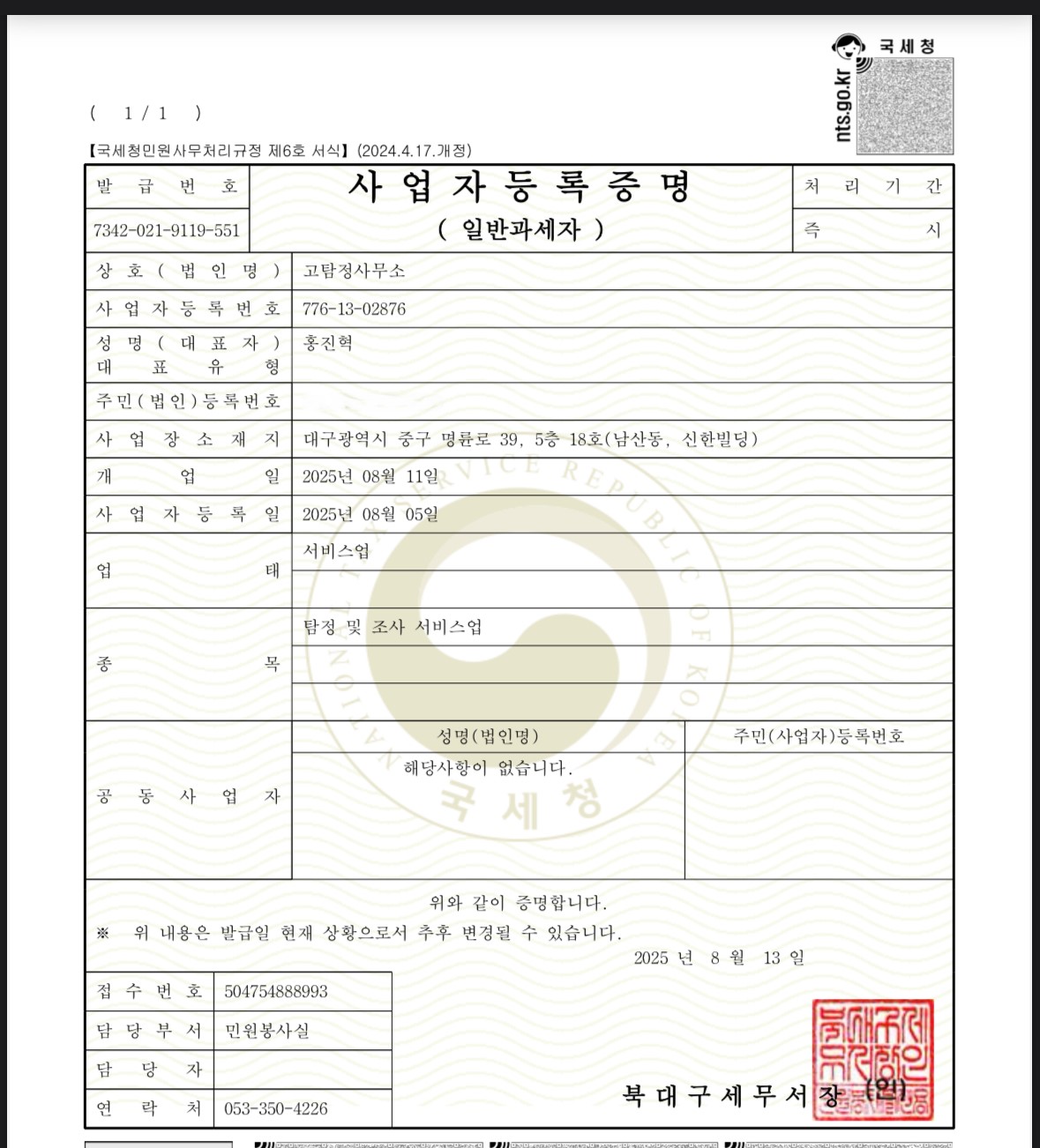 사업장 주소 대구 중구 명륜로 39 5층 18호(남산동)